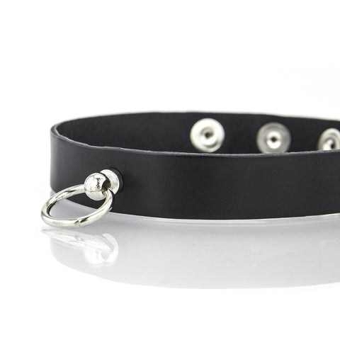 These leather collars from LXB have a small O-ring on the front that can be attached to a leash or anything you want to clip it to. Multiple snap closures to fit a wide size range.
